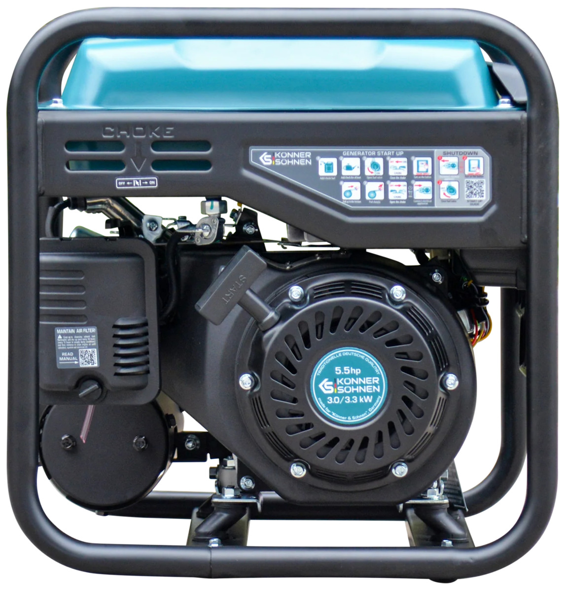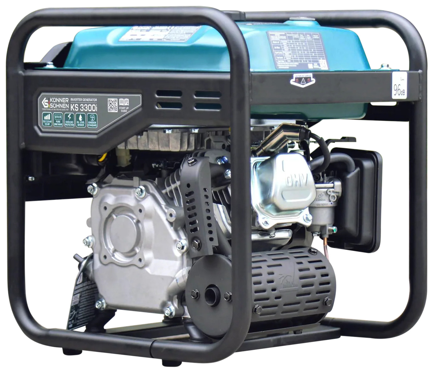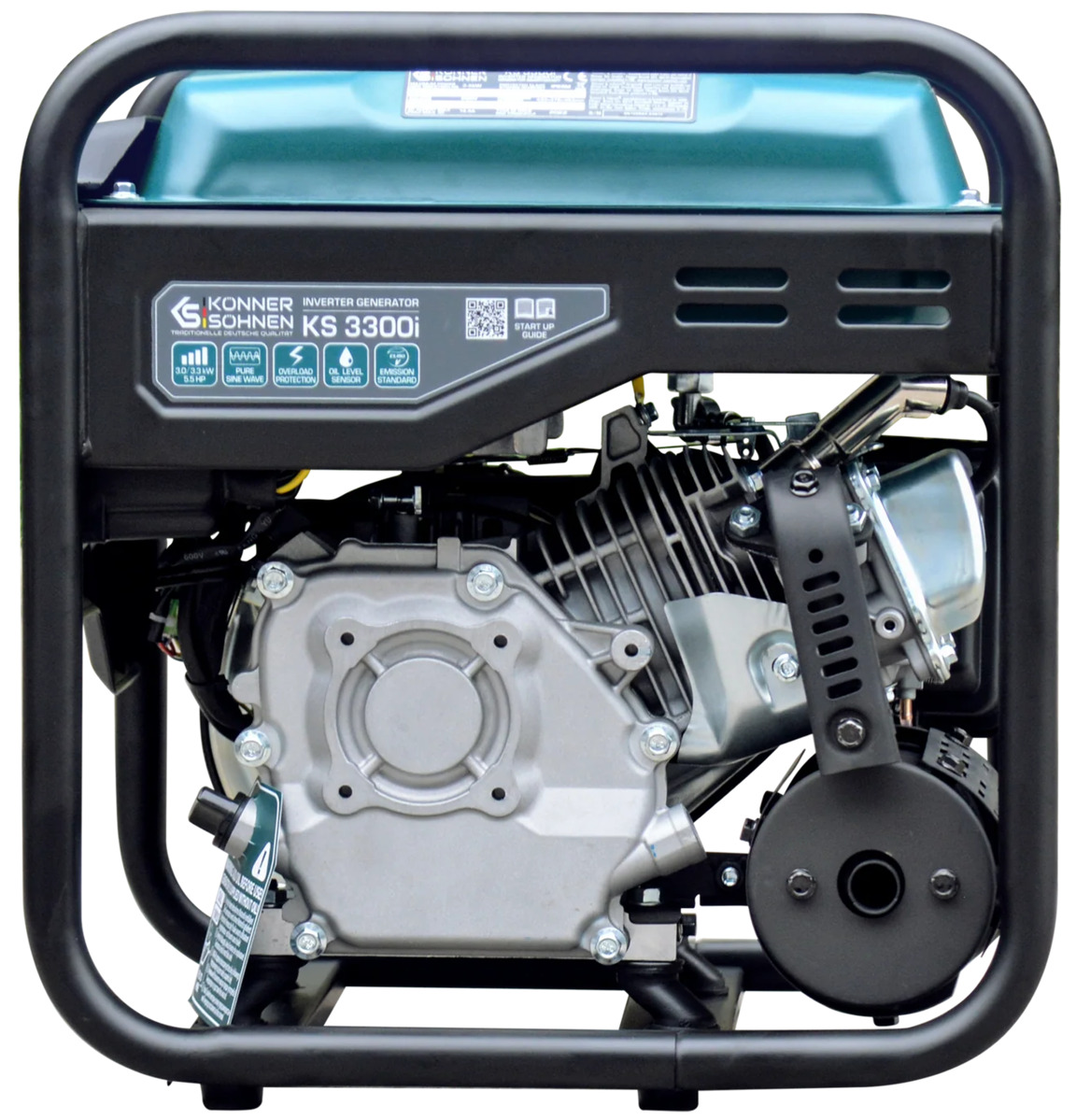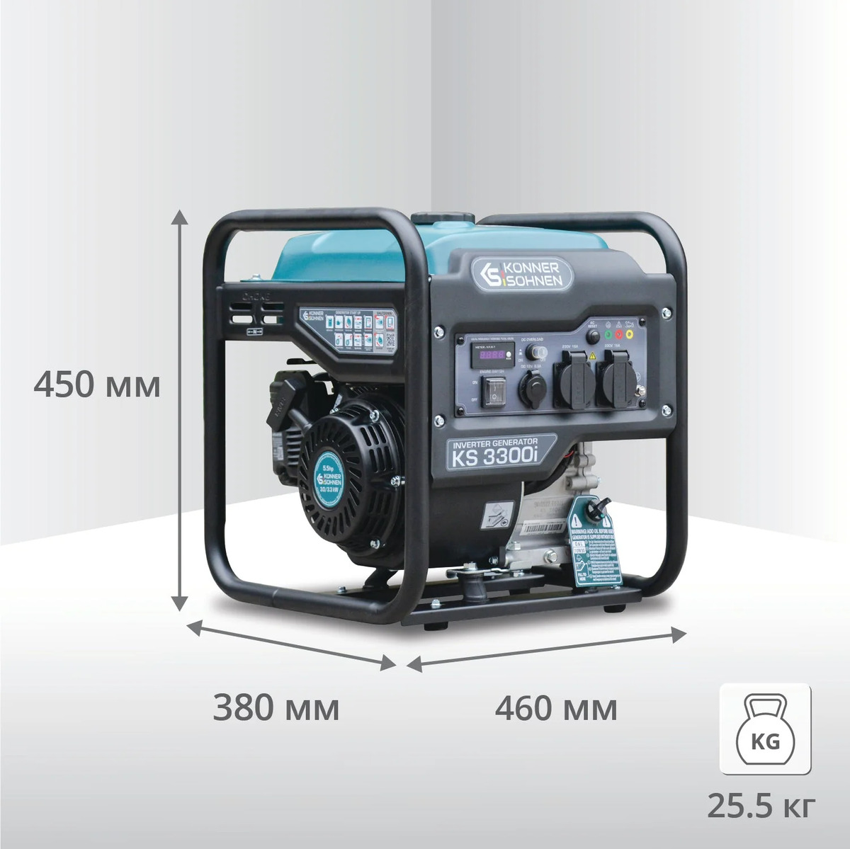 Однофазный переносной бензиновый генератор Konner&Sohnen KS3300i инверторного типа необходим как резервный источник электроэнергии для техники, электроники, оборудования, электроинструментов суммарной рабочей мощностью 3 кВт (максимальная - 3.3 кВт). Запускается при помощи ручного стартера. Оснащен двумя розетками 220В по 16А и выходом постоянного тока 12В для низковольтной нагрузки. Для устойчивой установки и гашения вибрации обеспечен опорными ножками.