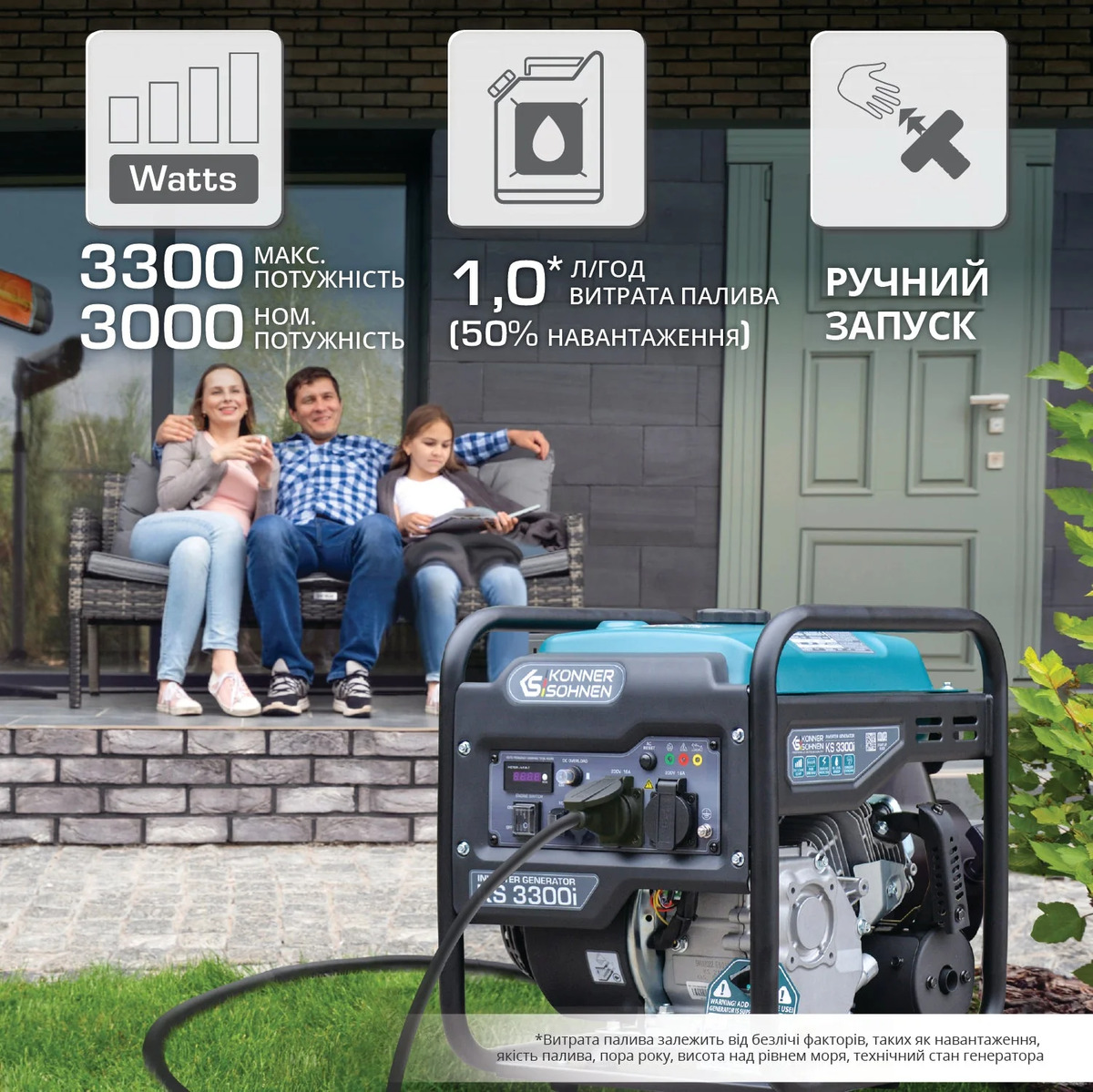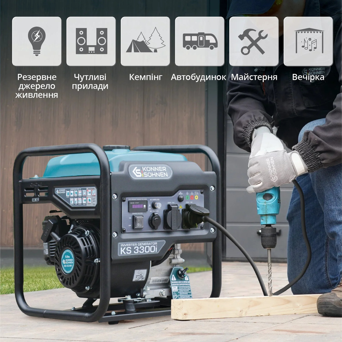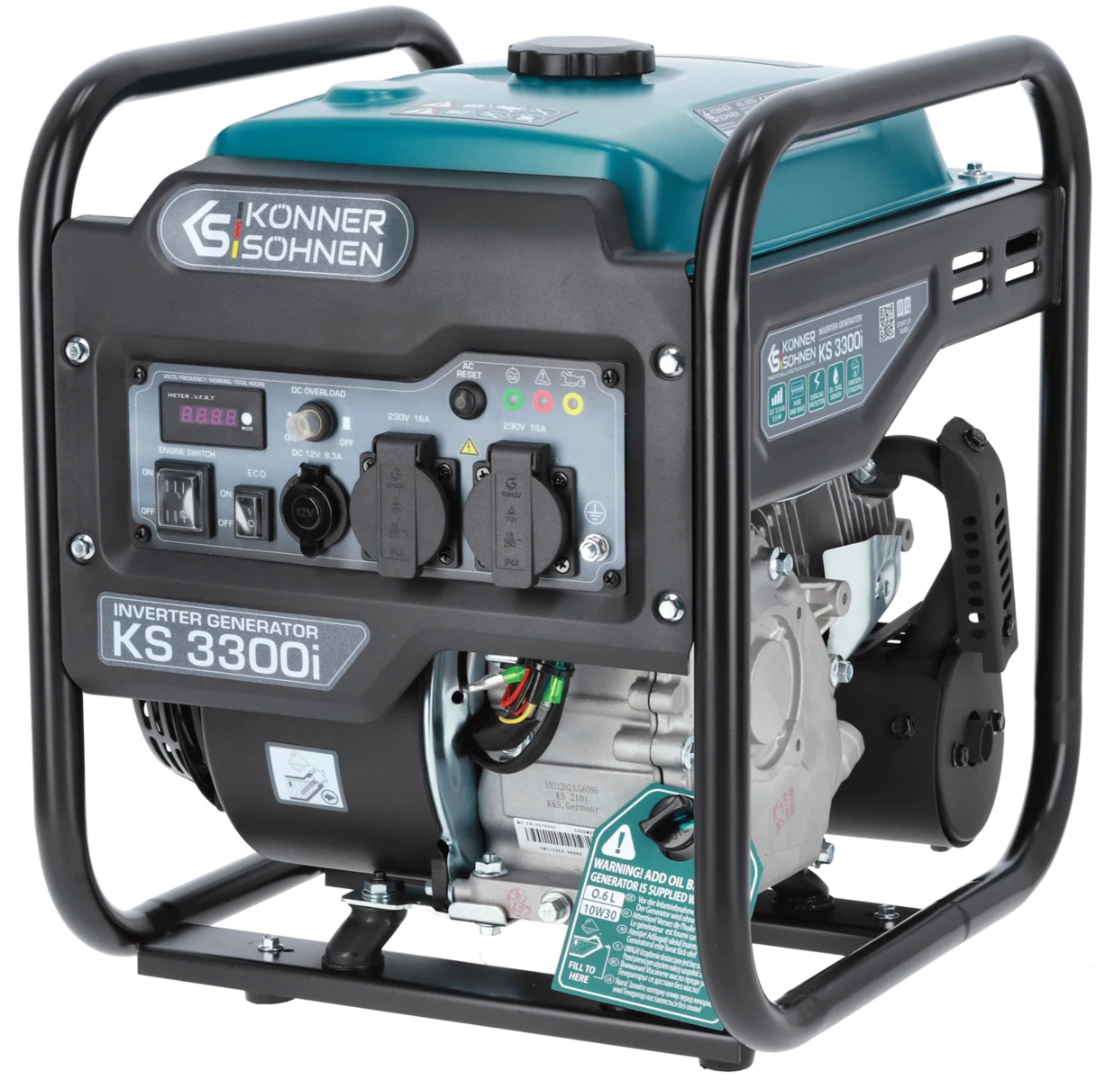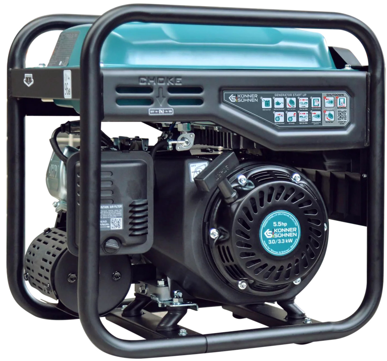 Однофазный переносной бензиновый генератор Konner&Sohnen KS3300i инверторного типа необходим как резервный источник электроэнергии для техники, электроники, оборудования, электроинструментов суммарной рабочей мощностью 3 кВт (максимальная - 3.3 кВт). Запускается при помощи ручного стартера. Оснащен двумя розетками 220В по 16А и выходом постоянного тока 12В для низковольтной нагрузки. Для устойчивой установки и гашения вибрации обеспечен опорными ножками.