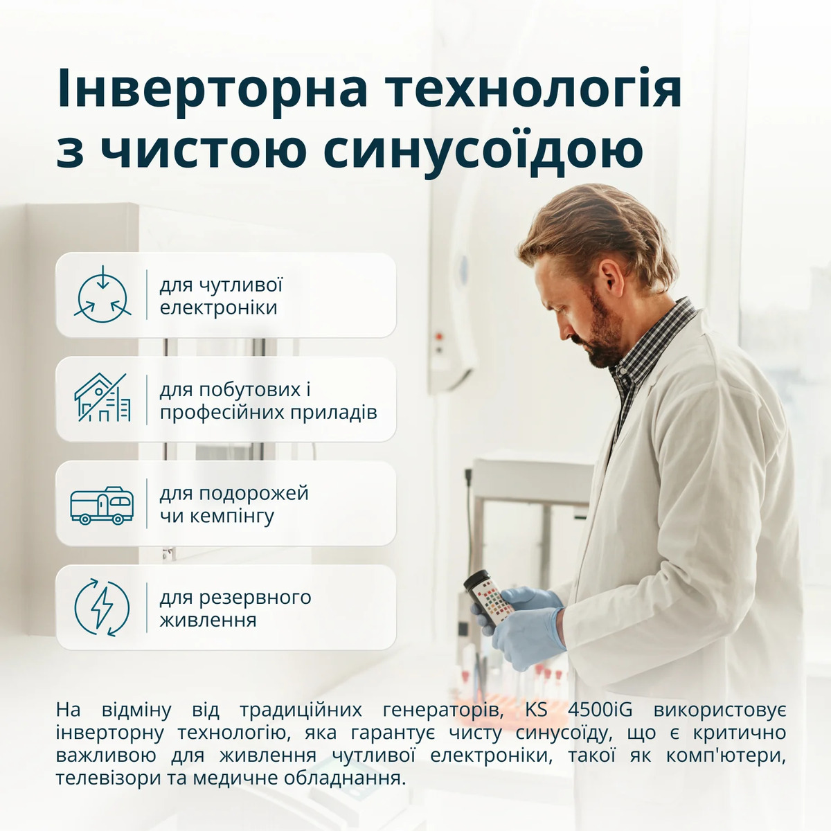 Электронный модуль управления с микропроцессорным контролем формирует выходной ток 220В с чистой синусоидой, подходящей для бытовой и профессиональной техники.