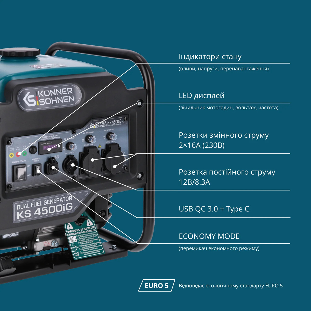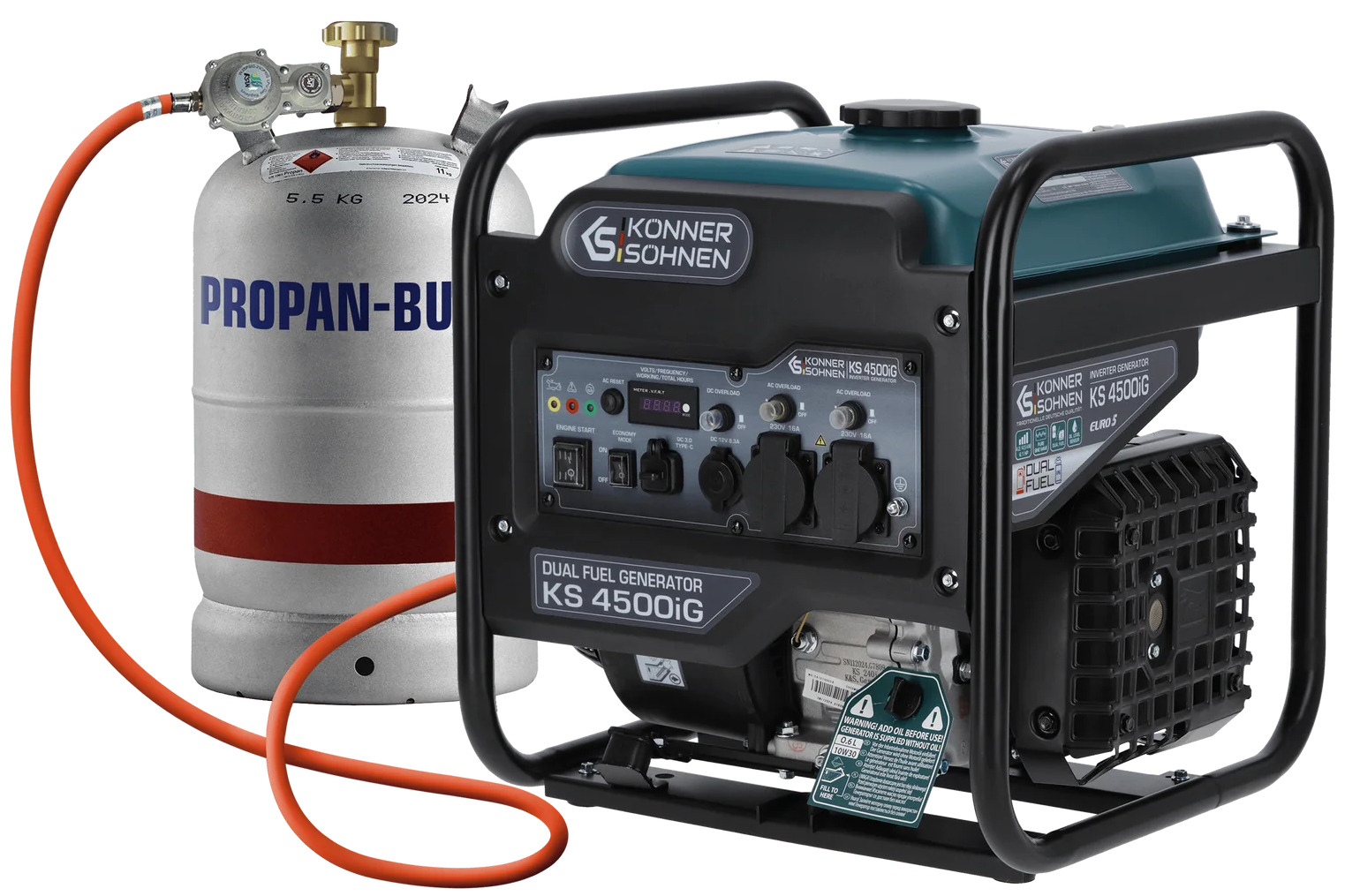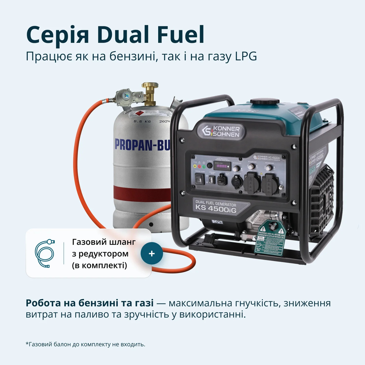 Konner&Sohnen KS 4500iG - двухтопливная инверторная генераторная установка, предназначенная для автономного электроснабжения в условиях, где требуется надежный источник тока. Модель совместима с бензином и сжиженным газом (LPG), что дает выбор топлива и снижает эксплуатационные расходы. Благодаря инверторной схеме генератор подходит для питания лабораторных приборов, серверного оборудования, медицинской техники и электроники, требующей качественного сигнала. Его удобно использовать на выездах, в быту, при аварийных отключениях, а также в туристических поездках и на даче.