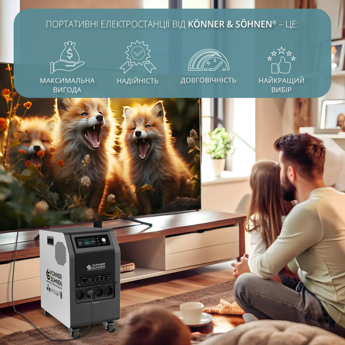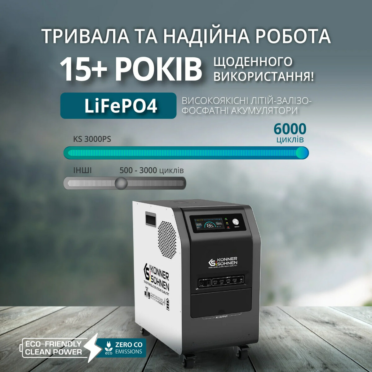 Портативні електростанції Konner & Söhnen® KS 3000PS поєднують передові технології для створення потужного, але при цьому екологічного джерела живлення. Оснащені літій-залізо-фосфатними акумуляторами, вони забезпечують більше 6000 циклів заряджання та здатні підтримувати роботу широкого спектру пристроїв завдяки чистій синусоїді. Відмінне рішення для використання в домашніх умовах, на відкритому повітрі та у бізнесі.