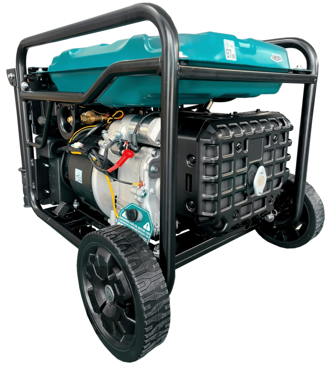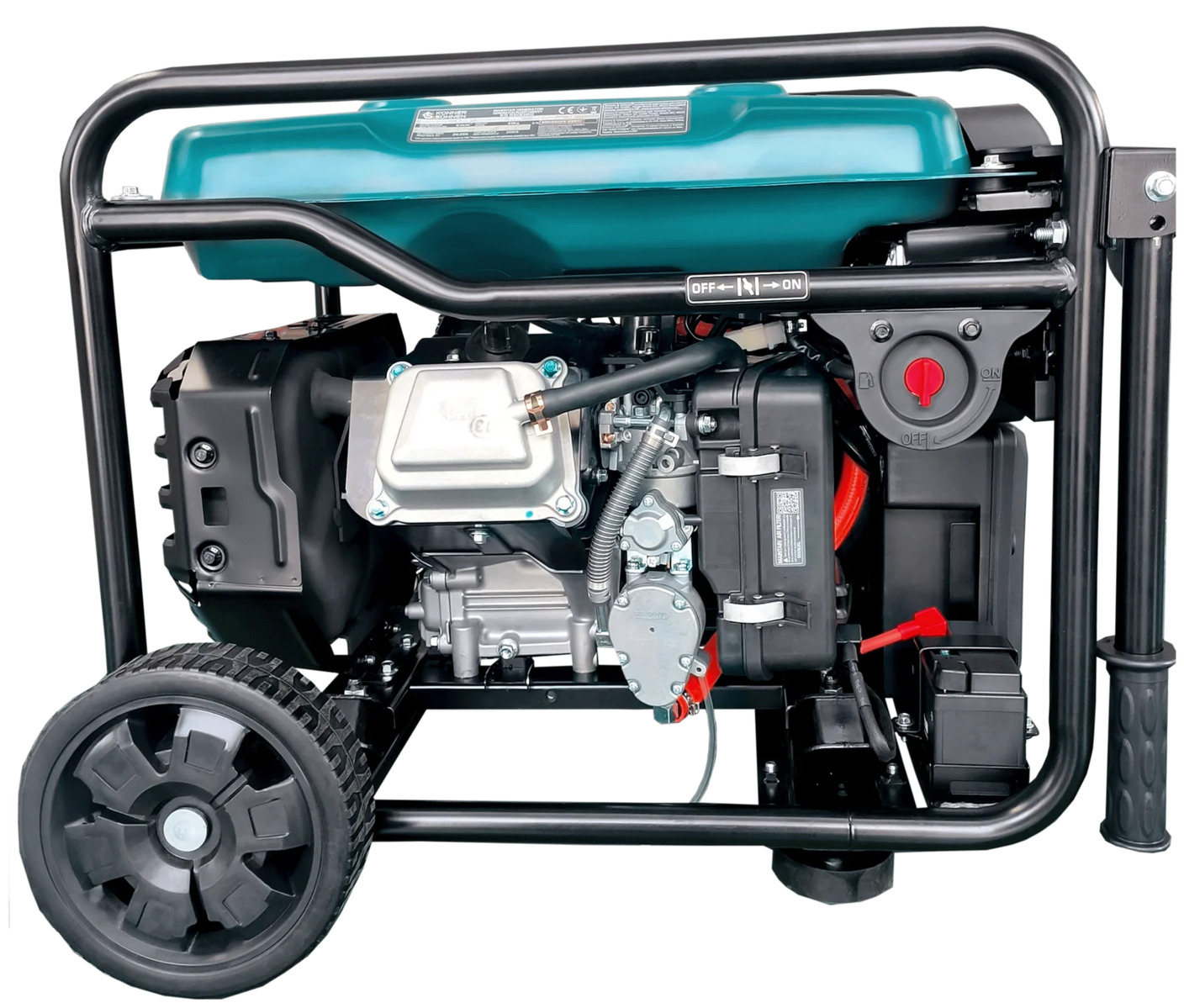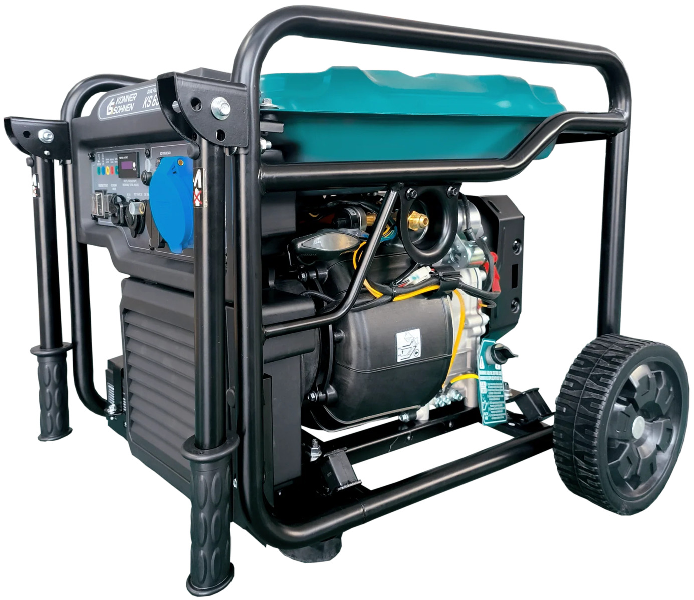 Генератор оснащений 4-тактним одноциліндровим двигуном KS 310i об'ємом 306 см.куб. з повітряним охолодженням та потужністю 10.4 к.с. Паливний бак на 17 л дозволяє працювати до 6-7 годин без дозаправки за середнього навантаження на бензині. Підключення газового балона здійснюється через стандартний редуктор (включено в комплект поставки). Мідна обмотка альтернатора підвищує надійність та довговічність. Багаторівневий захист автоматично зупиняє двигун за низького рівня оливи, перевантаження, короткого замикання.