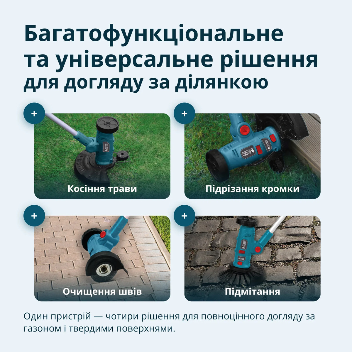 Швидкість обертання до 2400 об/хв забезпечує стабільну роботу за різних навантажень. Використання волосіні завтовшки 1.6 мм гарантує акуратне скошування, а змінні щітки допомагають підтримувати чистоту на ділянці. Невеликий рівень шуму робить інструмент придатним для використання у житлових зонах. Відсутність вихлопів та дротів підвищує зручність та безпеку експлуатації.